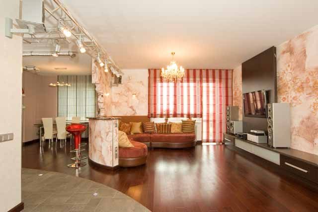 Так обычно и происходит. Первое, что видно при входе в квартиру – темные стена и пол. Прихожей придали нестандартную полукруглую форму и мрачно выкрасили, нарушая все оформительские каноны. Поскольку места здесь достаточно, цвет не давит, зато служит неплохой основой для восприятия вишнево-розовой гостиной. Вот уж где действительно царит клубная атмосфера! Ручная роспись стен, рваная кромка перегородки, домашний кинотеатр и объединяющий все элементы огромный диван с подушками – чем не чил-аут? За барной стойкой и почти концертной линией освещения – индустриальная кухня с нарочито-заметными трубами воздуховода. Да, не забудьте для полноты картины добавить стеклянную дверь в санузел и огромные подсолнухи на стене в прихожей. Фьюжн, одним словом, во всей красе. Гостям здесь должно нравиться по определению, но и хозяева в подобной атмосфере чувствуют себя как рыба в воде, а это, пожалуй, главное.