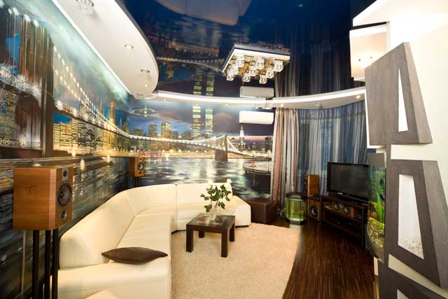 Основная идея заключалась в создании динамичного пространства, формирующего определенное настроение, создающего ощущение перспективы. Реализация ее – сложная, многослойная – разбита на отдельные задачи. На художественном уровне основной сюжет – ночной Манхэттен – воплощен художником Владимиром Халецким в виде развернутого панно в гостиной. Сложность работы заключалась как в объеме работы, так и в адаптации художественного произведения под требования конкретного объекта.