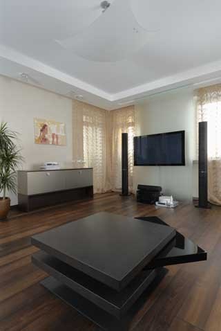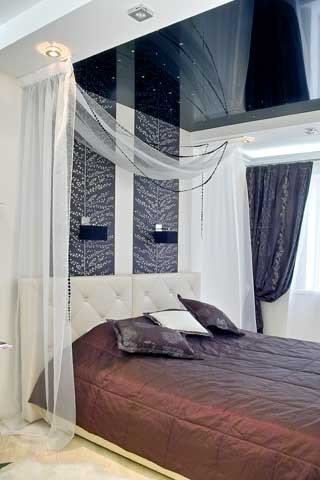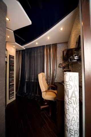 За навеянной супрематизмом массивной перегородкой с аквариумом расположился кабинет, изолированный ровно настолько, насколько это необходимо. По сути, он остается составной частью гостиной. Несмотря на различные варианты отделки и декоративные приемы, значительная часть усилий автора была направлена на формирование интерьера квартиры, как единого целого. На это работают сквозные пространства, единство подчеркивает линия натяжного потолка, не разбитая по отдельным комнатам, а охватывающая их все. Темный натяжной потолок – довольно смелое решение, но в данном интерьере оно оправдано. Находясь в равновесии с цветом пола и основного декоративного элемента – панно в гостиной, он как бы растворяется, перестает быть вещественным. А способность глянцевой поверхности отражать свет зрительно вытягивает помещения вверх, рождает ощущение ночного неба над головой.